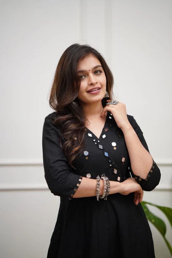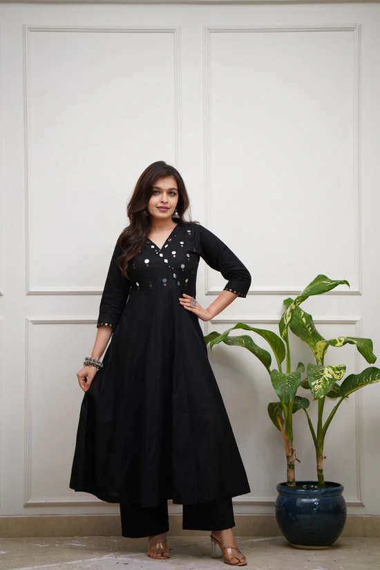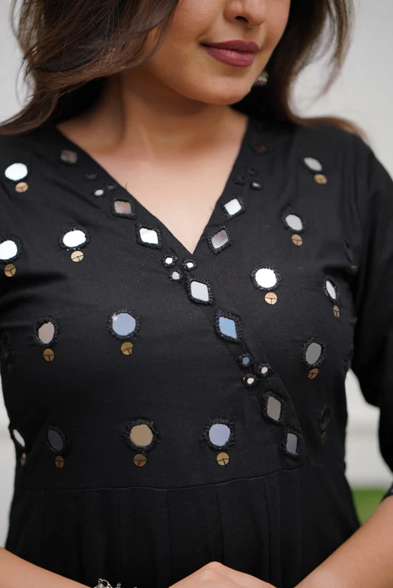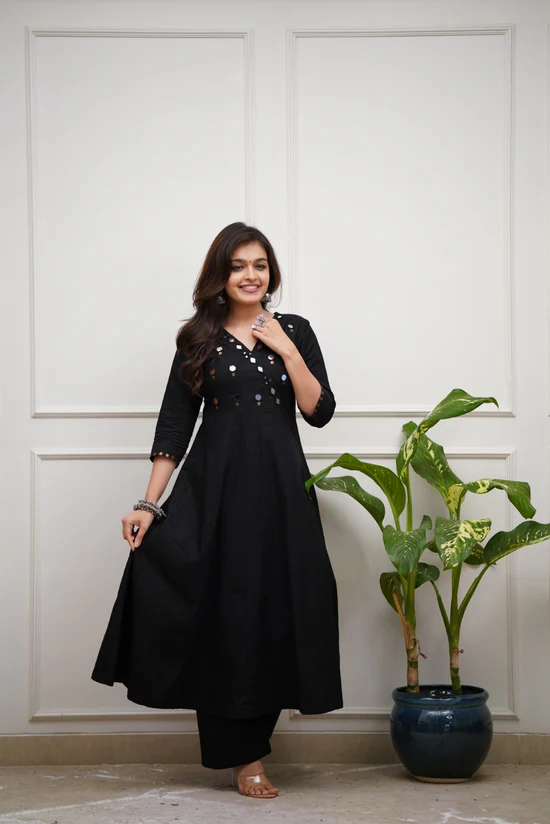 The kurti is beautifully embellished with delicate mirror work that adds a subtle festive shine without being overpowering. The classic black colour enhances the mirror detailing and gives the outfit a refined, sophisticated appeal. Designed with a flattering straight-fit silhouette, the kurti pairs perfectly with the matching cotton pant for a balanced and comfortable look.