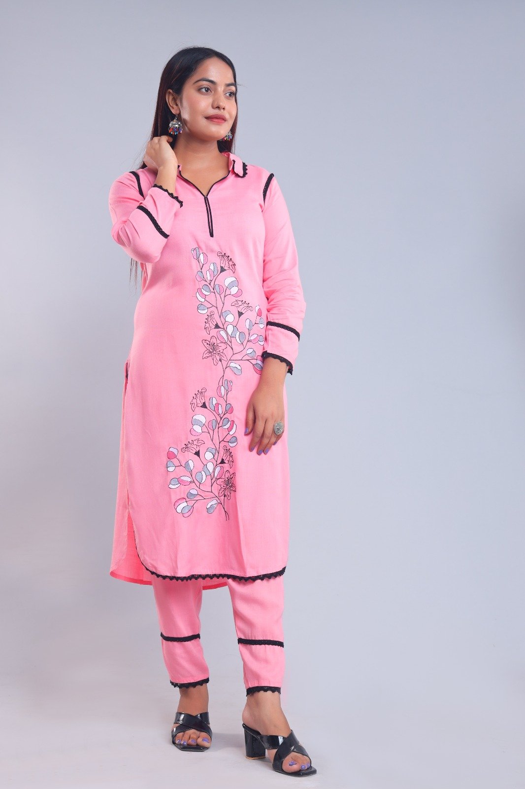 The soothing light pink colour gives the outfit a fresh, feminine and classy look, making it ideal for everyday wear as well as workwear styling. The matching straight-fit pant completes the coordinated look while ensuring comfort throughout the day.