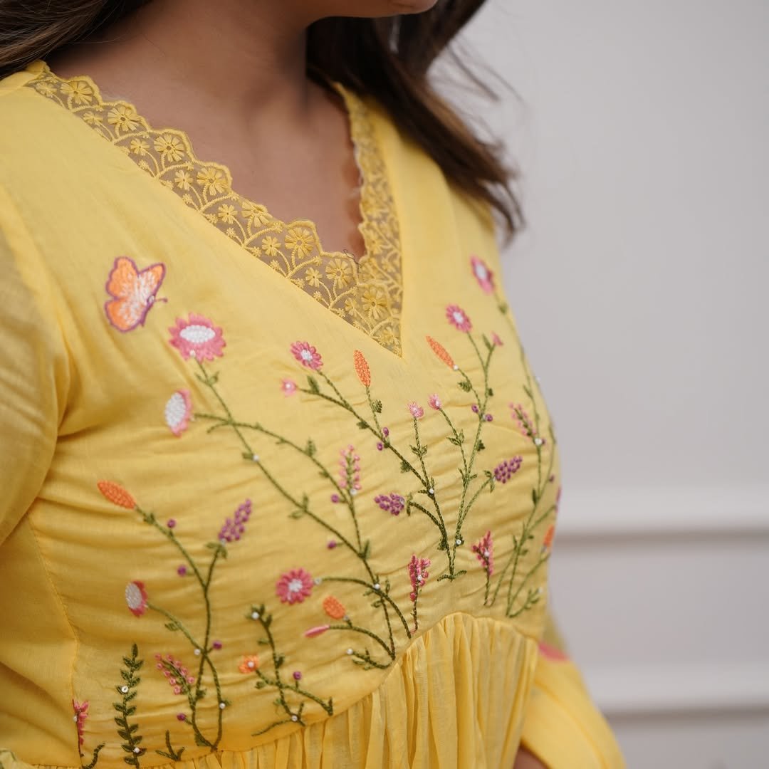 The Anarkali kurta features delicate floral thread embroidery on the front yoke and sleeves, enhanced with a flattering neckline and flowy silhouette that adds elegance to the outfit. The soft light yellow colour gives a fresh, bright and festive appeal, making it suitable for celebrations and special gatherings.