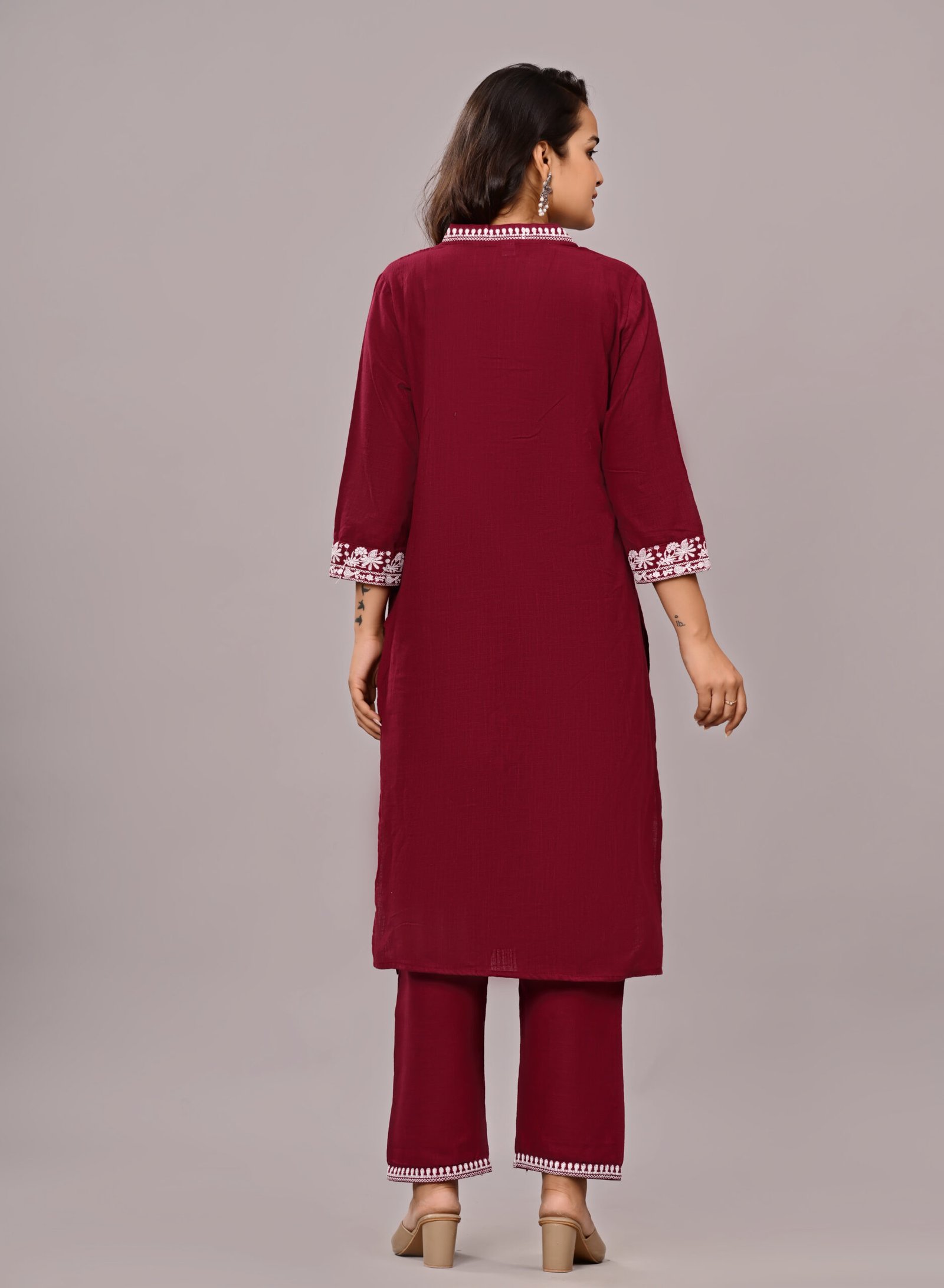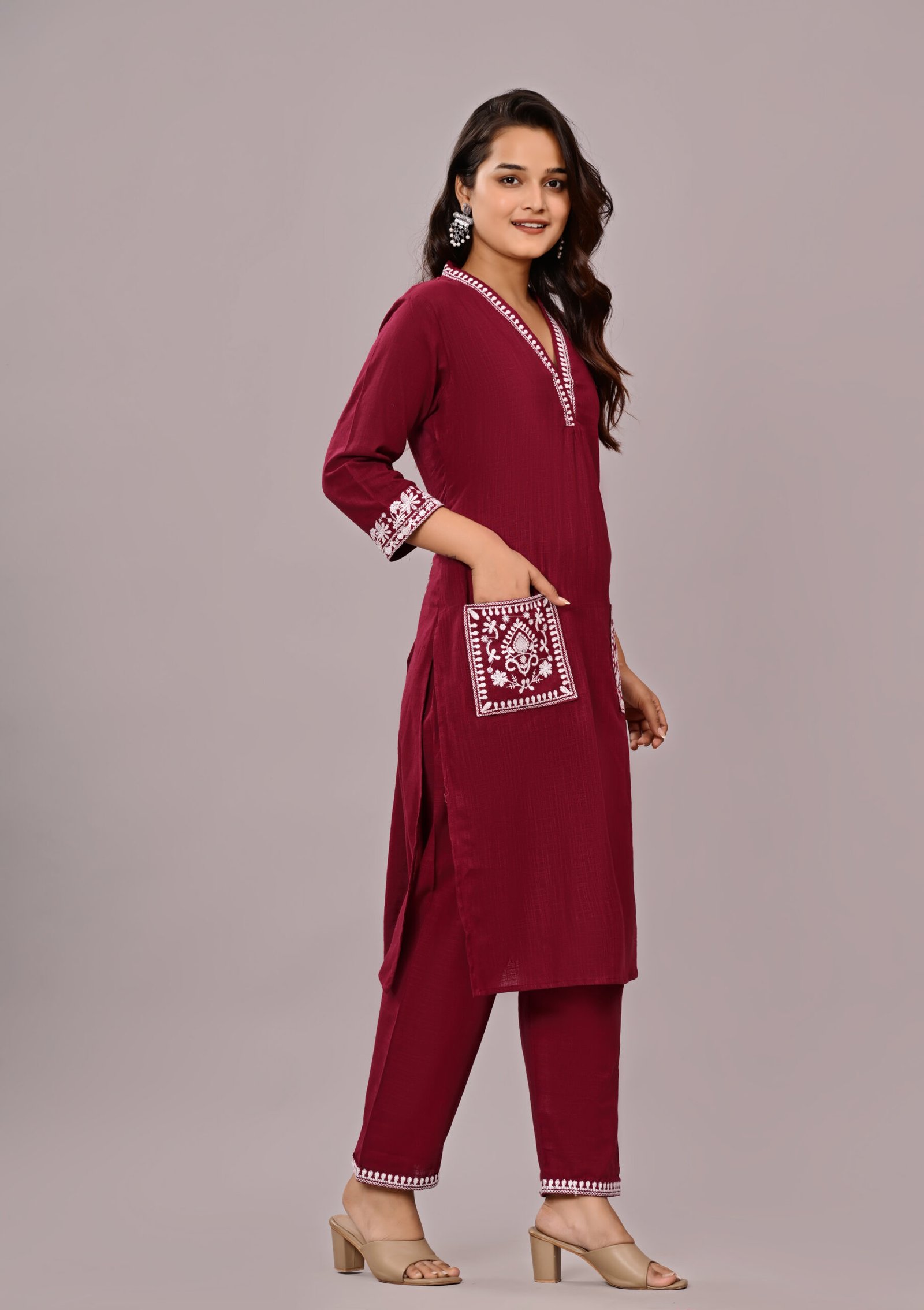 The kurti-style top features detailed white thread embroidery on the neckline, sleeves and dual front pockets — adding a premium, handcrafted touch to the outfit. Paired with matching maroon straight-fit cotton pants, the co-ord set delivers a clean, coordinated and stylish look.