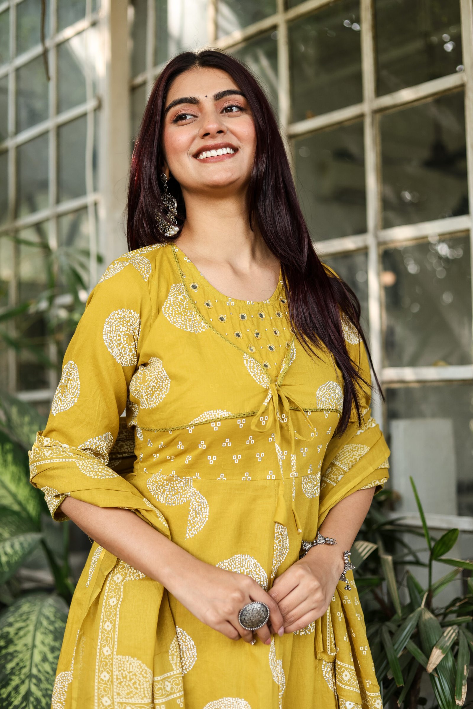 The Anarkali kurta features beautiful all-over prints with detailed work, creating a graceful and traditional silhouette. The mehndi green colour brings a fresh, festive and elegant vibe, making this suit set an ideal choice for weddings, festivals and special occasions.