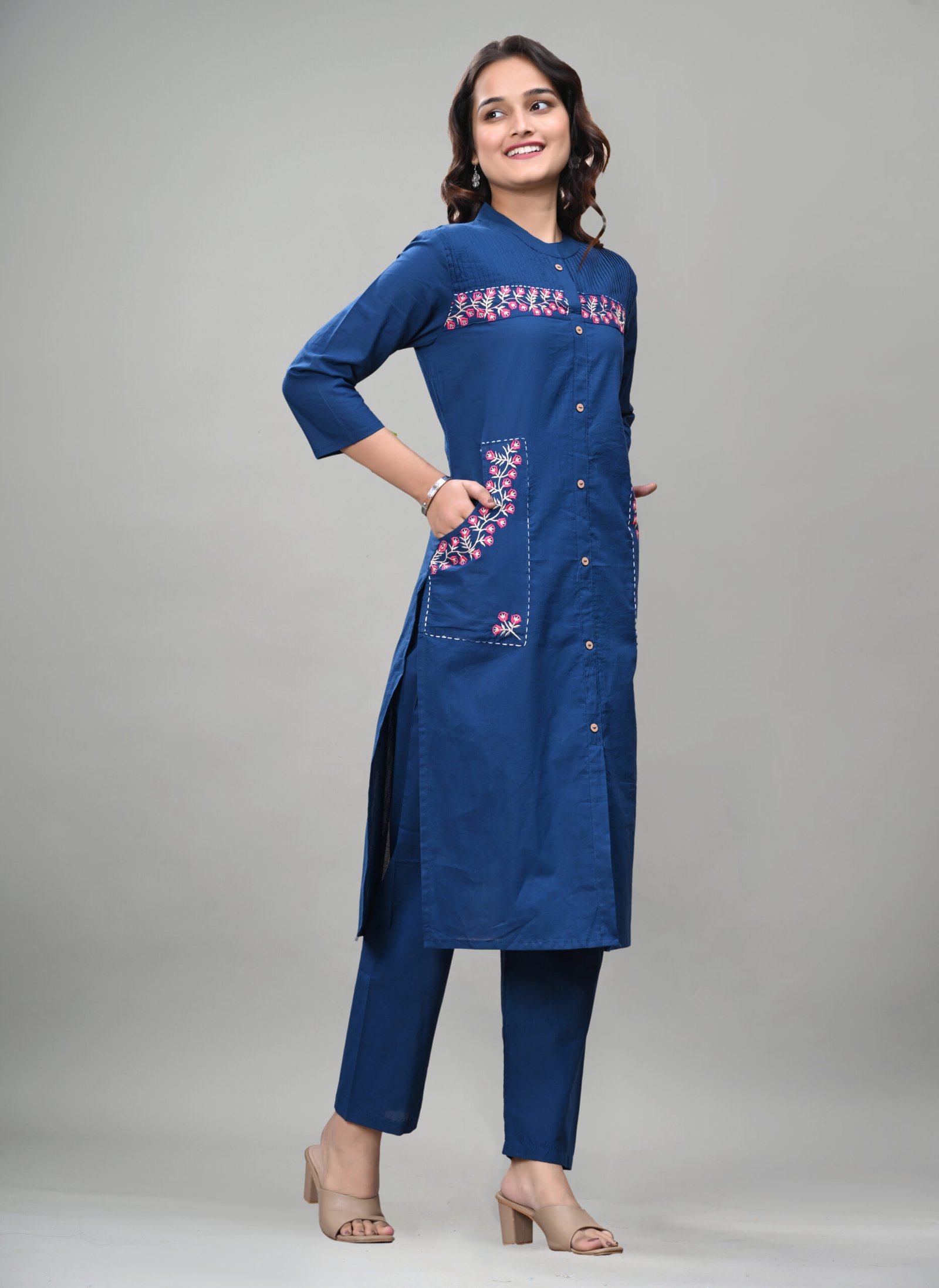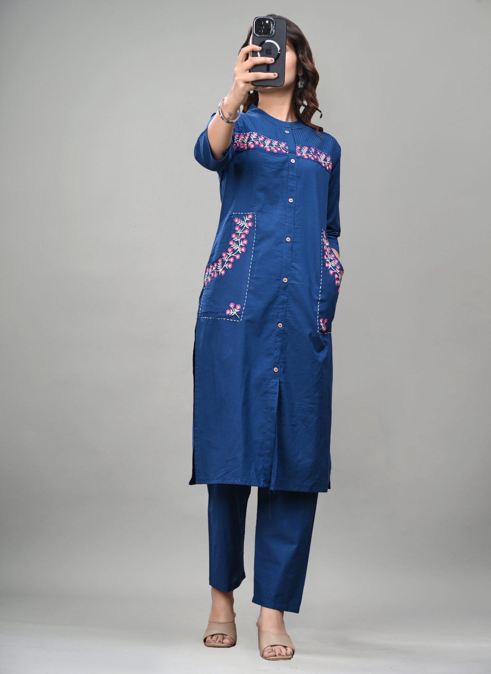 Upgrade your ethnic wardrobe with this Premium Navy Blue Embroidered Cotton Kurti Pant Set, designed for women who love comfort with effortless style. Made from soft and breathable cotton, this set features a straight-fit kurti enhanced with multicolour floral embroidery on the yoke and both pockets.