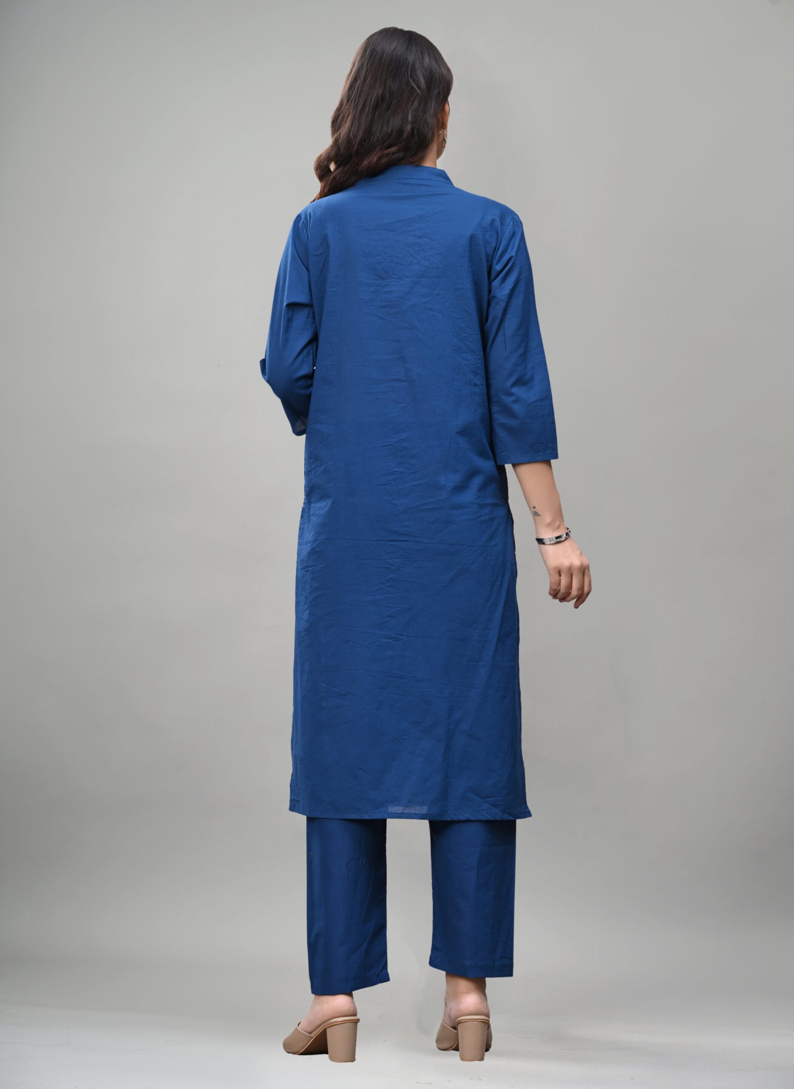 Ideal for office wear, casual outings, shopping, travel and everyday comfort, this navy blue embroidered set brings a polished and graceful look to your wardrobe.