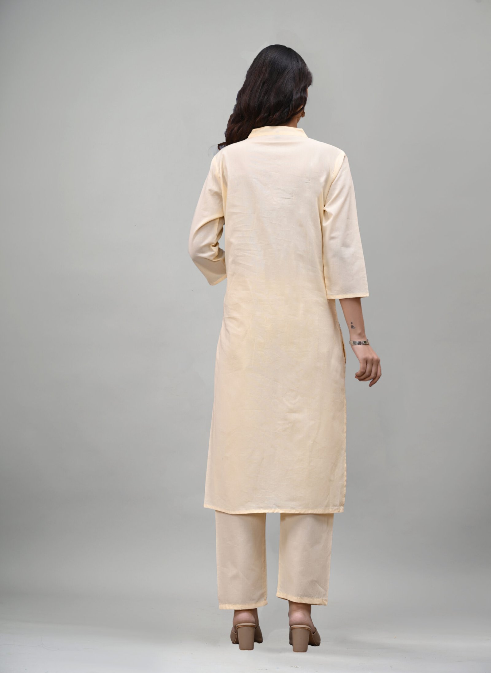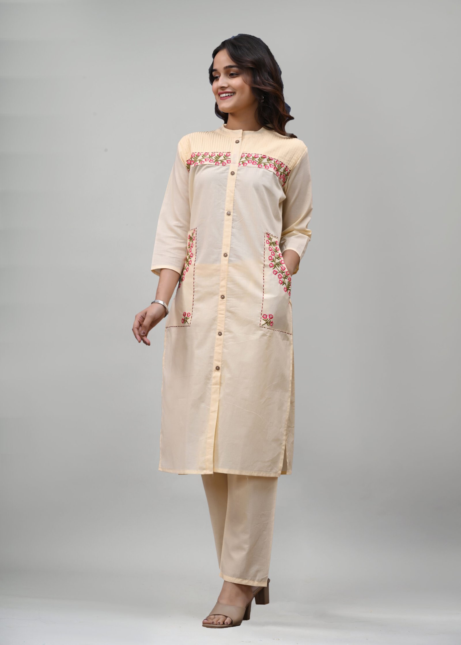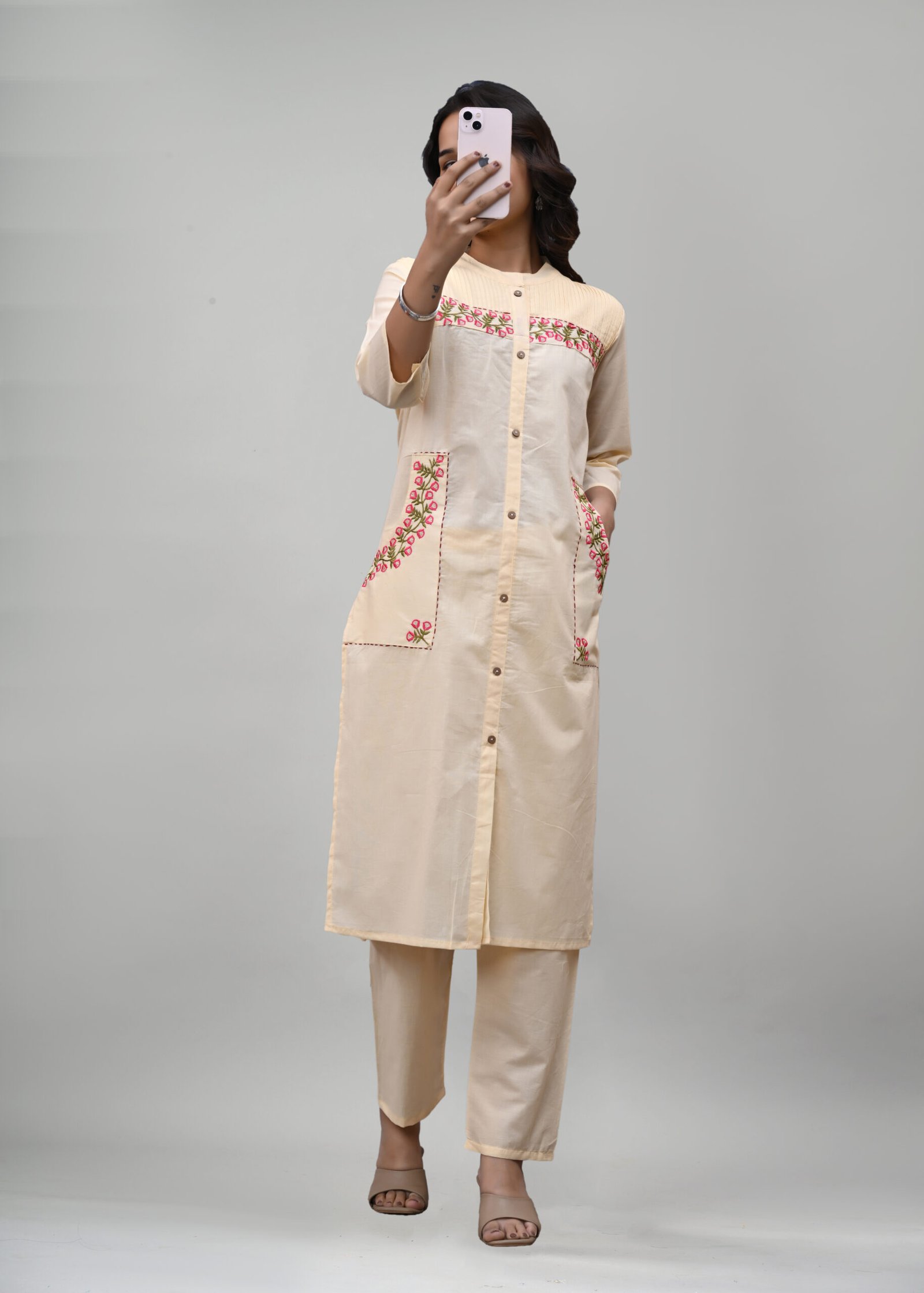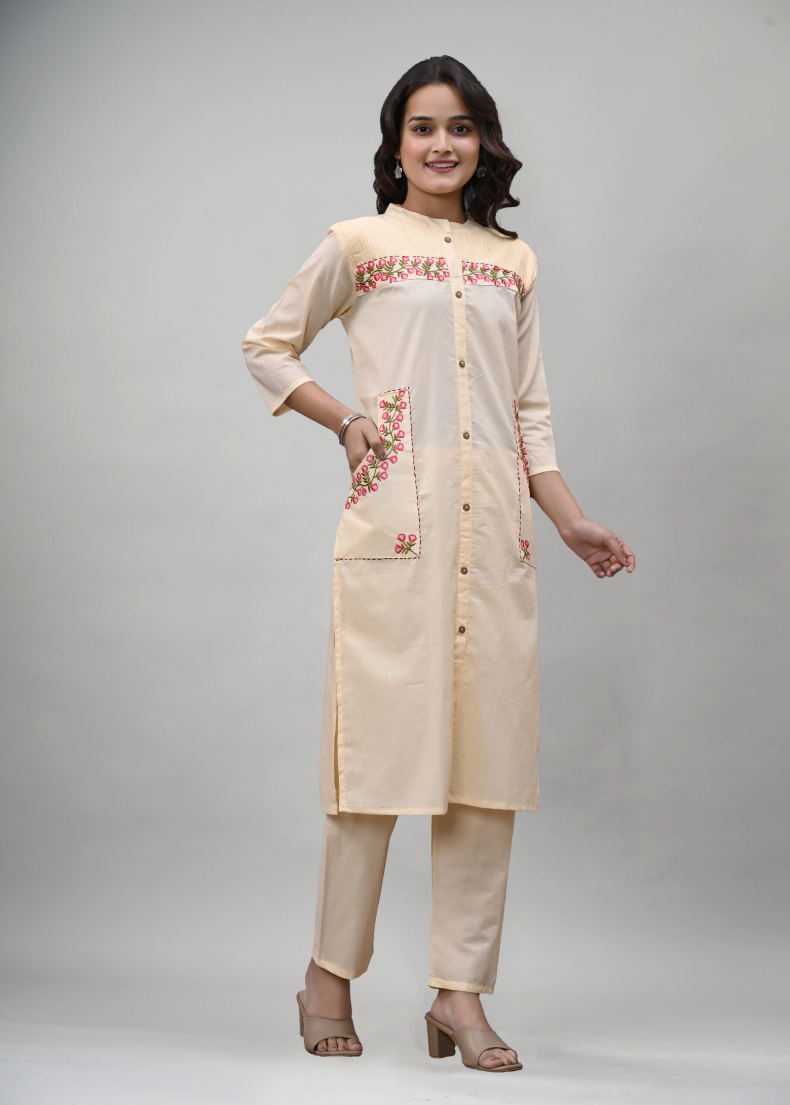 Give your ethnic wardrobe a classy upgrade with this Premium Off-White Embroidered Cotton Kurti Pant Set. Made from soft, breathable cotton, this set features a straight-fit kurti beautifully enhanced with multicolour thread embroidery on the yoke and both pockets.