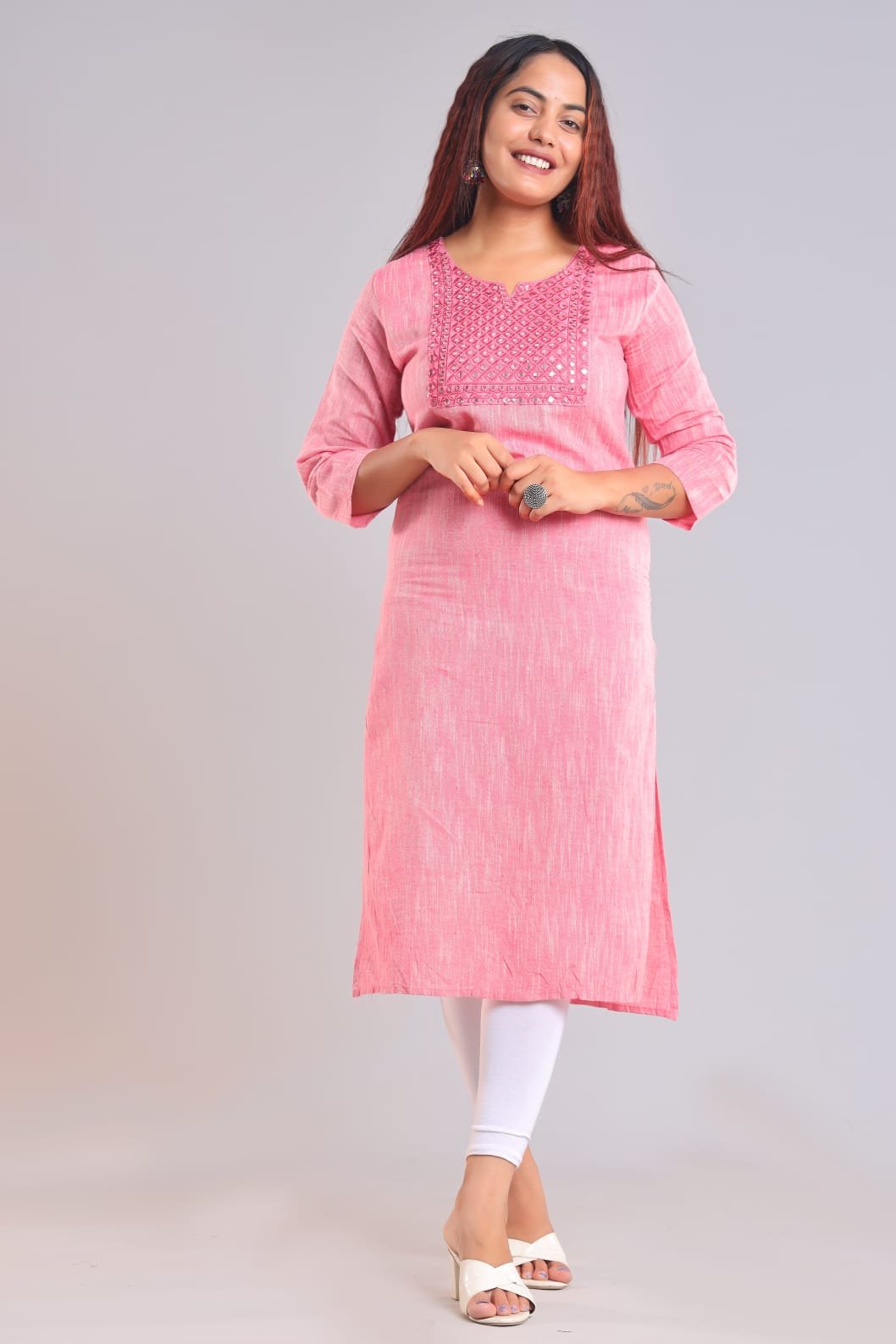 The kurti features fine embroidery work on the chest area, adding a subtle yet classy ethnic touch. The soft pink colour gives a fresh, feminine and elegant look, making it suitable for both everyday wear and festive styling. The straight-fit silhouette provides a flattering look and pairs effortlessly with pants, palazzos or leggings.