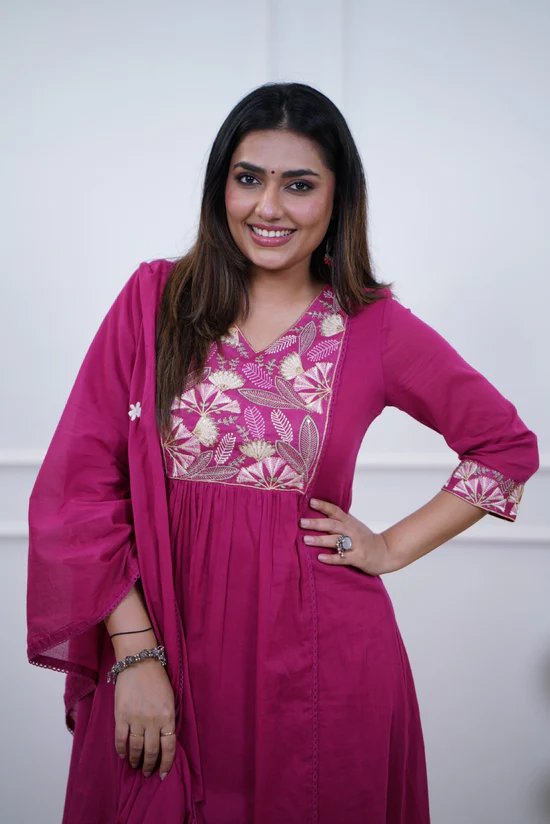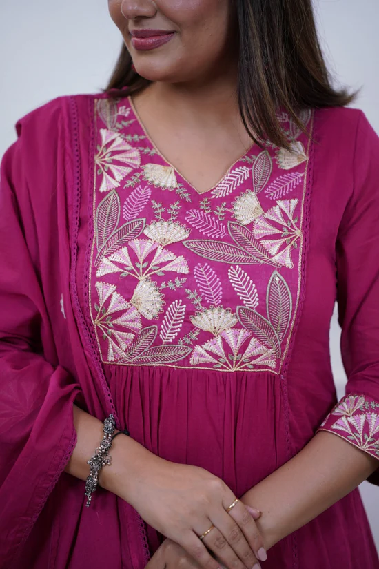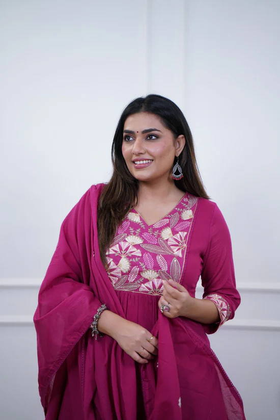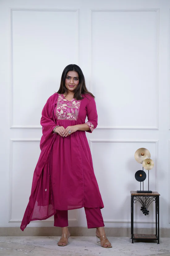 Add vibrant elegance to your ethnic collection with this Premium Rani Pink Cotton A-Line Kurta Pant Set with Dupatta. Designed with a flattering A-line silhouette, the kurta features beautiful multi-coloured embroidery on the yoke along with delicate embroidery detailing on the hems, giving it a rich and festive appeal.