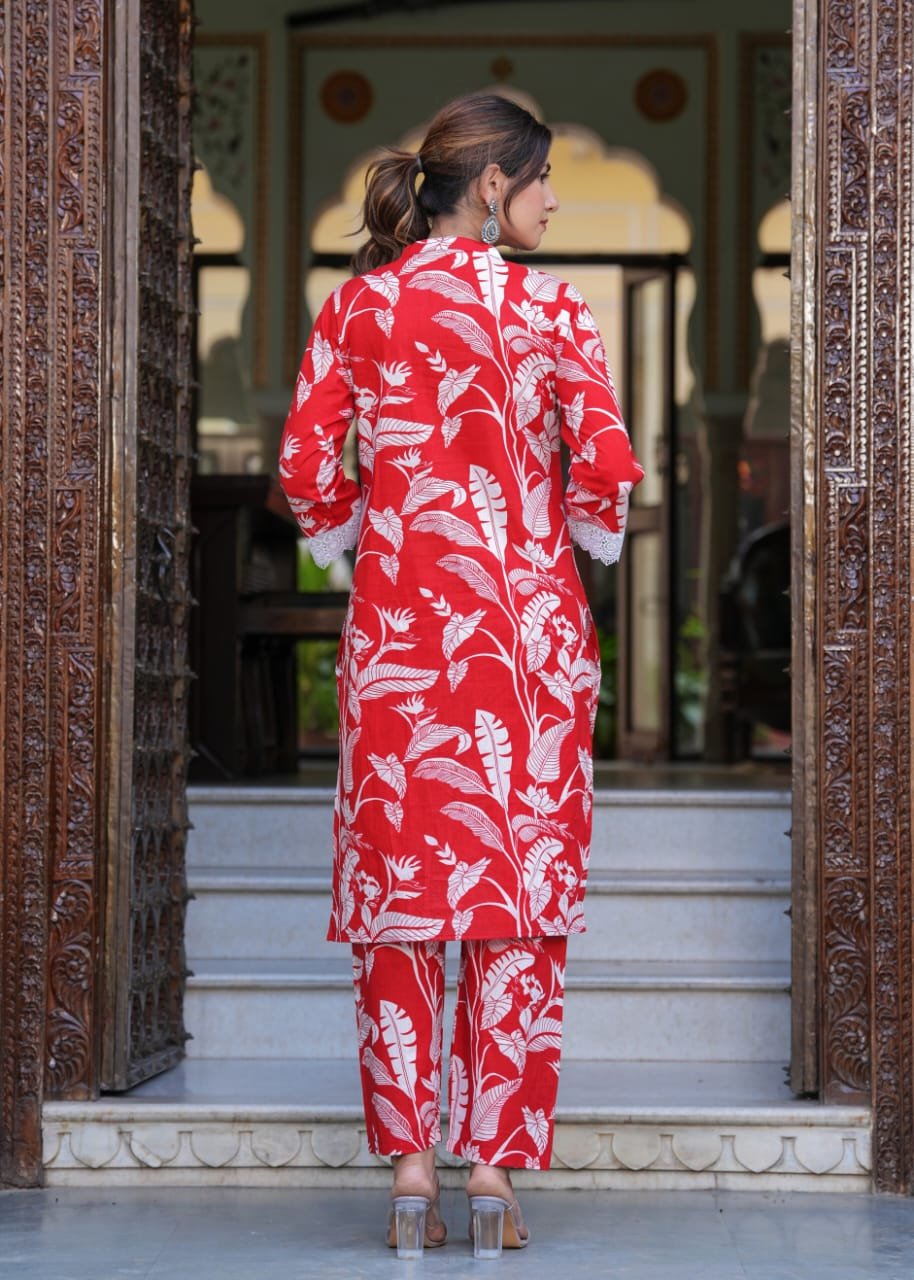 Make a confident style statement with this Premium Red Floral Print Co-Ord Set, designed for women who love comfort blended with elegant detailing. The beautifully crafted floral print top is enhanced with subtle cotton lace work, adding a refined and graceful touch to the outfit.