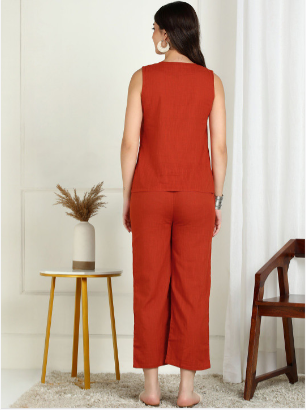Refresh your everyday ethnic wardrobe with this Premium Rust Orange Pure Cotton Floral Printed Embroidered V-Neck Top with Trousers. Crafted from high-quality pure cotton fabric, this set offers excellent breathability and all-day comfort.