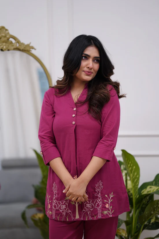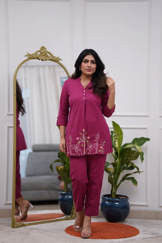 The rich wine purple colour adds elegance and sophistication, making it a standout choice for day outings, casual gatherings or semi-formal events. Made from comfortable and breathable fabric, this cord set ensures ease of movement while maintaining a polished appearance throughout the day.