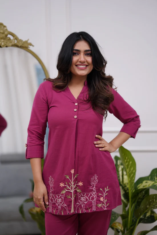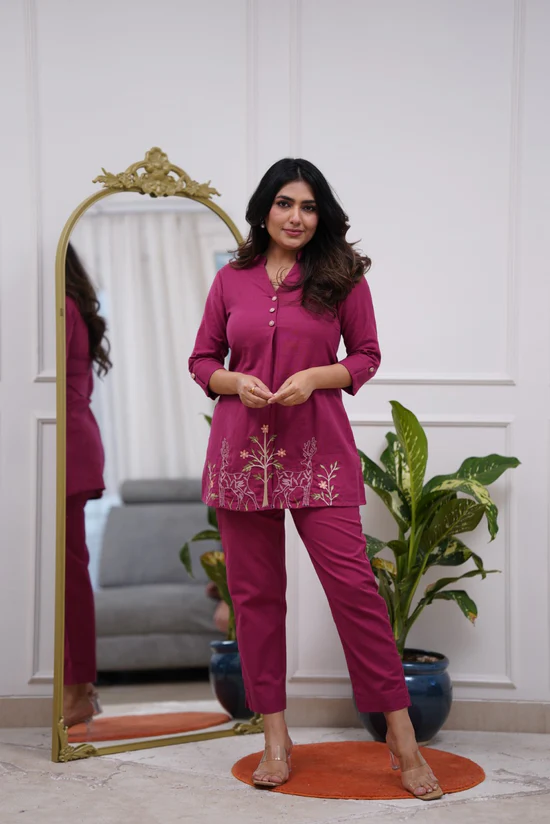 Step out in style with this Premium Wine Purple Cord Set, crafted for women who love a perfect balance of comfort and trend. Designed with a clean, modern silhouette, this co-ord set offers an effortlessly stylish look suitable for both everyday wear and special occasions.