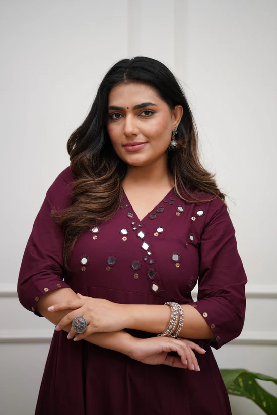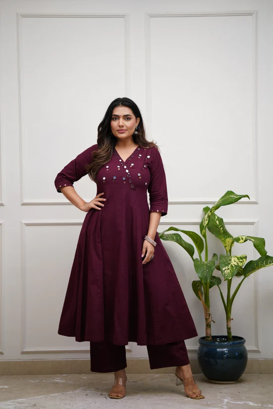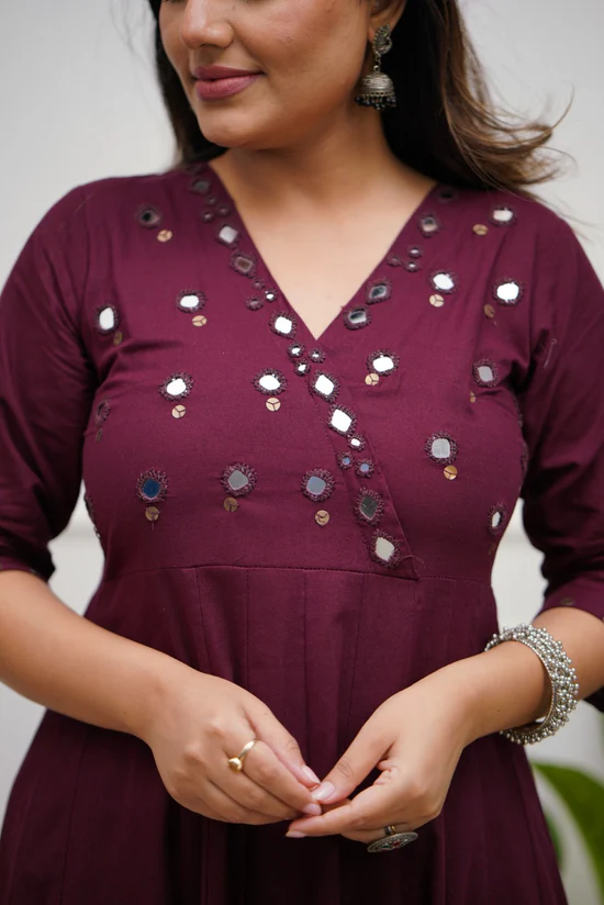 The kurti is beautifully embellished with delicate mirror work that adds a subtle festive shine without being overpowering. The rich wine purple colour enhances the mirror detailing and gives the outfit a refined, sophisticated appeal. Designed with a flattering straight-fit silhouette, the kurti pairs perfectly with the matching cotton pant for a balanced and comfortable look.