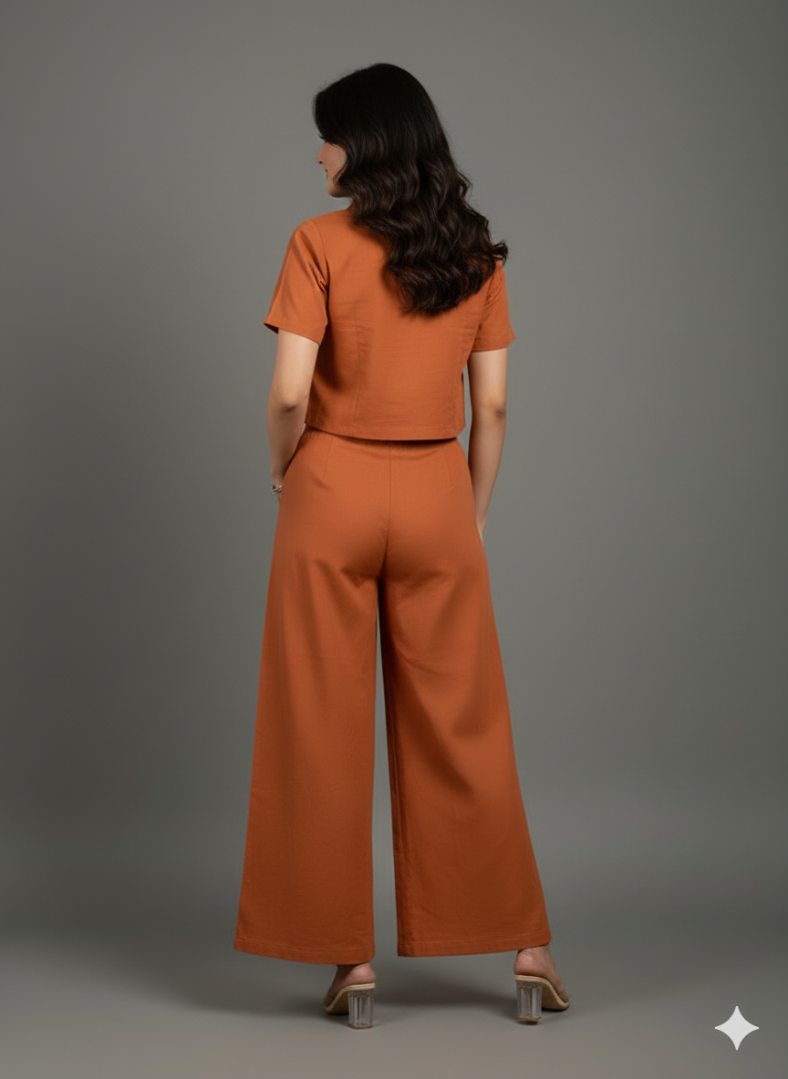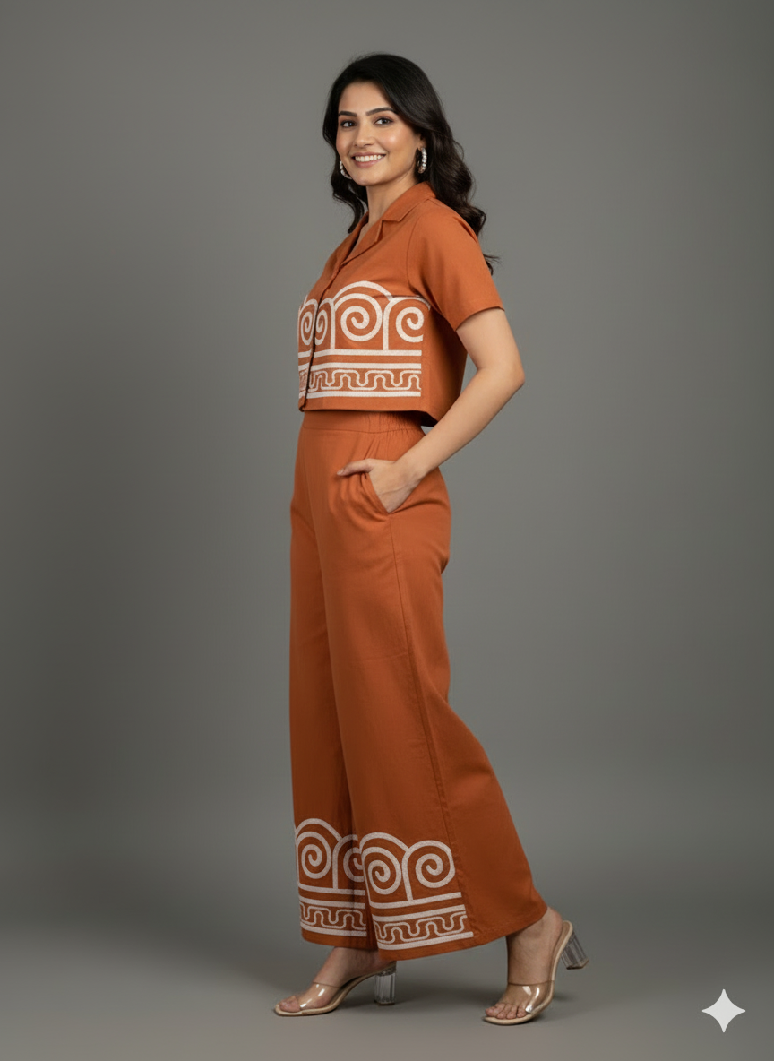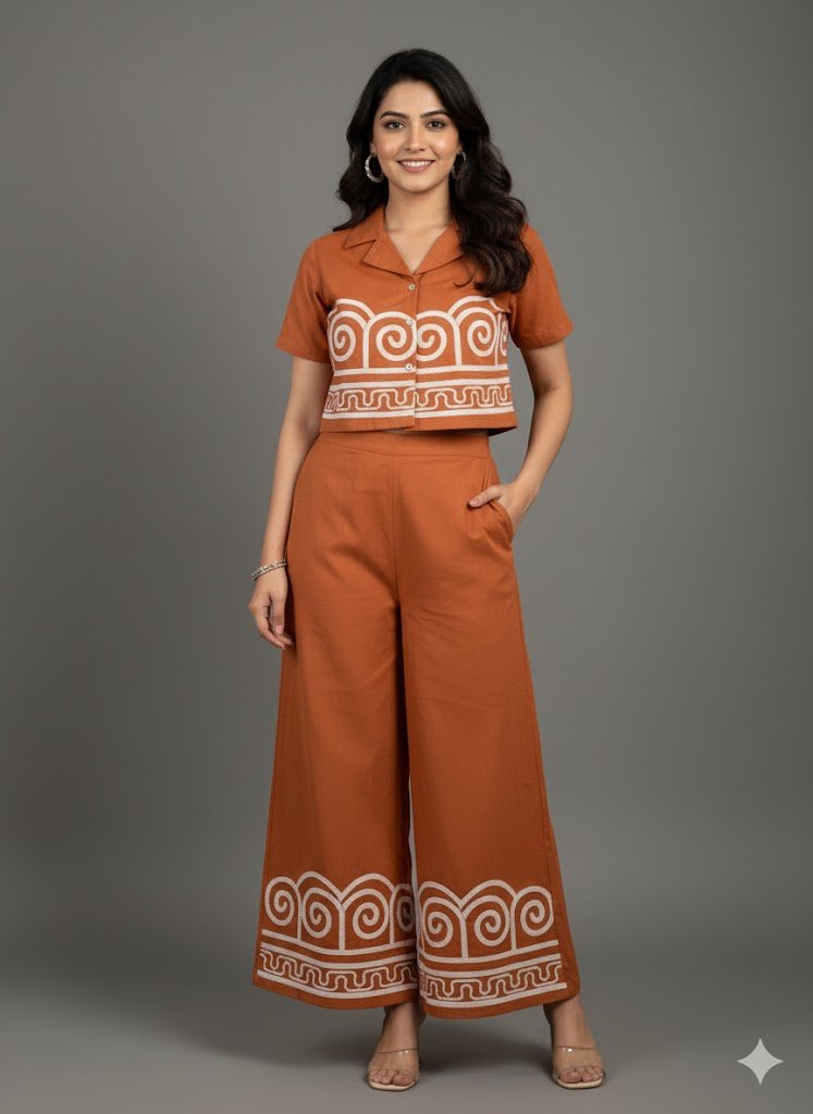 Upgrade your style with this Premium Rust Orange Cotton Co-ord Set, crafted with comfort and elegance in mind. The set includes a smart short-sleeve shirt featuring a modern collar, button-down front, and beautiful white embroidered motifs, paired with super-comfortable wide-leg pants that carry matching embroidery at the hem for a balanced, designer look.